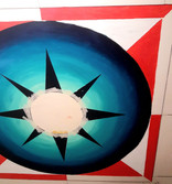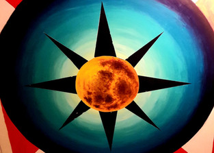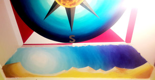 Yeah sure, you see the compass, and the moon. But you have questions right?? Yes, the North, South, East and West in the mural point to the same directions in real life. If you followed a straight line on the North arrow from my mural, you would end up in the Baltic Sea š In the mural, the N and S point to a pair of landscape paintings. The North Arrow points to a cold scene, with mountains and snow, but has a warm sky with setting sun. I tried for the opposite affect on the south. Hot desert climate with a cold blue sky. My goal was to juxtapose the ideas of north, south, hot, and cold. The E and W arrows point to a brick design, which blends the color of the two skies together. To shed some more details about these landscapes: the sun is rising on the eastern side of north, and setting on the western side of south. š