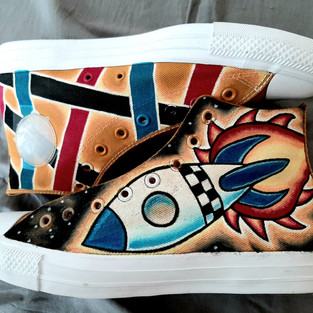 One thing to note as well, how I balanced the colors between the shoes. The rocket exhaust glows red to give a burning sensation, while the ray-gun is shooting a cold blue heated laser. As many of you know, it is actually the blue stars that burn the hottest. Taking a step further back, you will notice that the red on each shoe is toward the ankle while the blue/white on each shoe is towards the toes. No particular reason to match the colors to the body parts, but totally intentional to balance the colors forward to backward. This allows the shoes to match up despite the fact they depict two different types of objects. I know they both have the same theme of Vintage Sci-Fi, but the color balance helps to solidify their belonging in a subtle way.